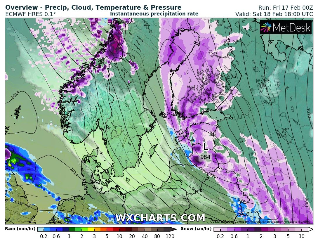 Reede (17.02.) lähenes Atlandilt kiiresti aktiivne madalrõhkkond. See jõudis päeval Norra rannikule ja õhtuks ületas juba Skandinaavia ja jõudis Läänemerele.